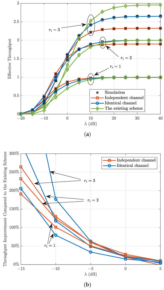 Figure 8 plots the effective throughput and the corresponding percentage throughput improvement compared with the existing scheme in [25] versus the transmit SNR with different transmission rates, where . It can be observed from Figure 8 that the effective throughput increases as the transmit SNR increases and becomes saturated at high transmit SNR due to the transmission rate constraint. Moreover, the effective throughput floor is improved by increasing the transmission rate. Figure 8 also shows that the smaller the transmission rate, the closer effective throughput floor is to the transmission rate. This is due to the fact that the loss of reliability increases with the increase in transmission rate. Finally, Figure 8 shows that the proposed scheme enhances the throughput of the system compared with the existing scheme in [25] at low transmission rates and transmit SNRs.