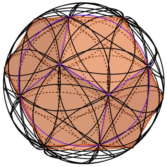 Most research on circle configurations concerns planar configurations. For example, the Miquel configuration in the Euclidean plane has eight points and six circles such that each point lies on three circles and each circle contains four points; its Levi graph is the skeleton of both the rhombic dodecahedron and the Bilinski dodecahedron []. Our configurations will usually not be planar. The point-circle configuration in Figure 1 lies in 3-space and is associated with the dodecahedron (via the E-constructed).