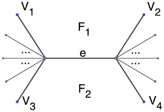 In Figure 2, the two faces and of Q meet at edge e, and . As every edge of Q lies in two faces of Q, each set contains 2, 3, or 4 vertices, according to whether both faces at e are triangles, one face at e is a triangle, or no face at e is a triangle. There are instances of polytopes in which two edges e and can share the same edge neighborhood, that is, ; for example, each pair of antipodal edges of the 3-cube has this property. However, in almost all cases we are interested in, the edge neighborhoods contain 3 or 4 vertices and uniquely determine the respective edges, e. In these cases gives a combinatorial configuration referred to as the combinatorial E-configuration of Q.