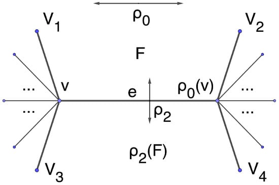 For an abstract regular polyhedron Q, the stabilizer of the base edge, e (say), leaves invariant and is given by the subgroup isomorphic to . In the notation of Figure 3, the generators and act on like the permutations