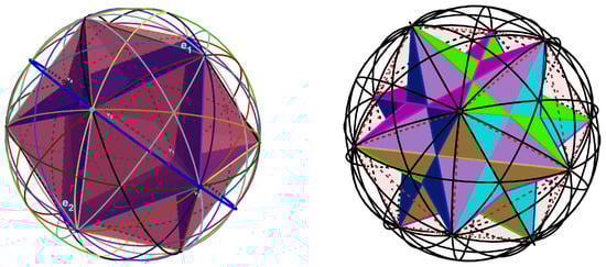 each contributing a circle configuration. The polyhedra on the left in (5) are the three Petrie–Coxeter polyhedra, with convex faces and skew vertex figures. The configuration for is shown in Figure 14.