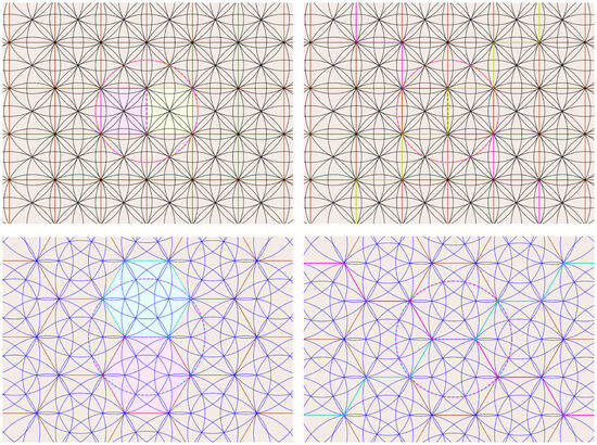 For more general polyhedra-like structures such as the regular polygonal complexes K of [], there are generalizations of the E-construction method. For example, if the faces at every edge e of K occur in cyclic order such that every pair of successive faces in this order satisfies the coplanarity condition relative to e, then a circle configuration can often be obtained in much the same way as before, namely by choosing the circles that pass through the four (or three) vertices determined by each pair of successive faces. The simplest such complex is the 2-skeleton of the cubical tessellation in , that is, the complex formed by the vertices, edges, and square faces of the tessellation. The resulting circular configuration is point-circle transitive and is shown in Figure 16.