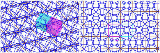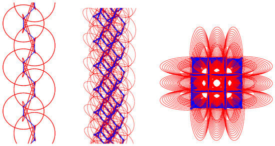 The three circle configurations for the blends with apeirogons, , are more complicated. The facets of Q are regular helical polygons rising above the faces of the planar polyhedron P. In the E-constructed circle configuration, the circles similarly rise above the faces of P following the helical faces of Q. The three configurations for , , and are shown in Figure 11, Figure 12 and Figure 13.
