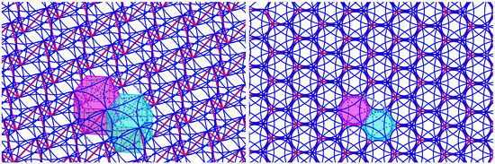 The regular skeletal polyhedra have been completely classified and are also known as the Grünbaum–Dress polyhedra (see Grünbaum [], Dress [], McMullen & Schulte [,] (Ch. 7E), and McMullen []. Using the classification scheme of [] (Ch. 7E), the altogether 48 regular polyhedra naturally fall into the following classes. There are eighteen finite polyhedra, namely the five Platonic solids and the four Kepler–Poinsot polyhedra (see []), which are also referred to as the classical regular polyhedra, and their Petrie duals, as well as six planar polyhedra, namely the regular tessellations by triangles, squares, and hexagons, and their Petrie-duals. There also are twelve “blended” polyhedra, denoted , obtained by blending the six planar polyhedra P with either a line segment or a linear apeirogon L positioned on a line perpendicular to the plane of the planar polyhedron. Strictly speaking, the geometry of the blended polyhedra depends on the ratio of the edge lengths of the planar and the linear components, but if these ratios are discounted, there are twelve polyhedra. Finally, there are twelve “pure” regular polyhedra. The geometry of some regular skeletal polyhedra is somewhat more involved.
