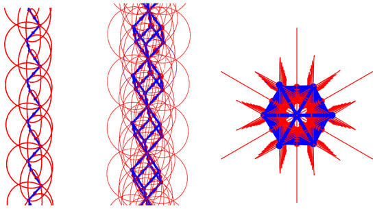 Circle configurations for , the blend of the hexagonal tessellation with an apeirogon. The helical faces of the polyhedron “rise above” the hexagons of the hexagonal plane tessellation , with two helical faces per hexagon, and with these faces sharing every third vertex. The figure on the left indicates the circles associated with the edges of the two helical faces “over” the same hexagon, with red and blue circles arising from the red or blue helical face, respectively. The figure in the middle shows a top view of this arrangement of circles. The figure on the right shows a top view of the family of circles generated by the six helical faces sharing a vertex of the polyhedron.