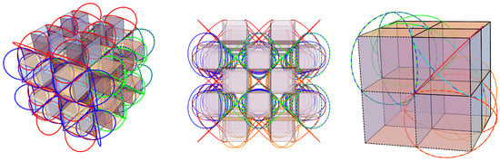 Two views of the circle configurations for . The figure on the right shows how a block of cubes of the underlying cubical tessellation contributes to the circle configuration: six of the eight cubes contribute two circles per cube, and the other two do not contribute a circle.