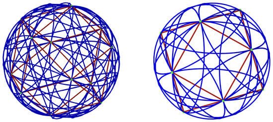 The polyhedra and in the second and third rows of (4) are geometrically distinct but combinatorially isomorphic. They share the same vertex sets. Still, these two geometrically distinct polyhedra share the same circle configuration, with 20 points and 30 circles. The edge sets of either polyhedron determine the sets of blocks , and thus, the circle configurations are the same. The configuration for is depicted in Figure 5 and is the same as the configuration shown in Figure 1 relative to . Again, colors have been added for visual clarity.
