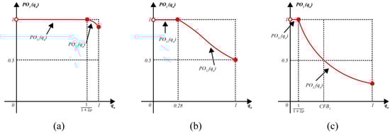 The key parameters influencing Model R-III are outlined in Table 6. Supposing that A is constant, and are distributed with . Since is assumed to be , can be obtained as . In the following proposition, (1) the shape of as shown in Figure 4 varies depending on the value of , (2) for , and (3) exists if and only if . Figure 4a shows that the CFB does not exist since exceeds 50% regardless of the value of . Figure 4b shows a graph of for and . Figure 4c shows a real case of a BLU company, where and . It can be observed that an imperfect inspector overestimates with if , overestimates with if , and underestimates with if .