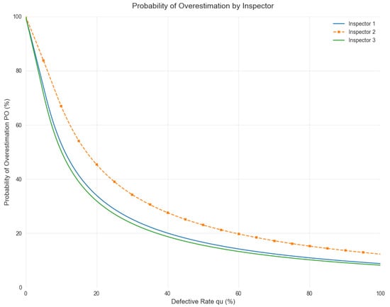 Figure 1a indicates that , determined exclusively by the inspector with , consistently remains above the 50% horizontal line, regardless of extremely low inspection error values. For instance, when , the probability of overestimation exceeds 90.9%: