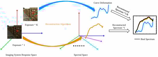 Schematic diagram of the multispectral reconstruction algorithms’ sensitivity to changes in exposure level. Using a multispectral reconstruction algorithm of exposure asymmetry to establish a reconstruction model at one exposure level (Exposure*1) to reconstruct the spectral reflectance of objects at different exposure levels (Exposure*1, Exposure*K) can cause the reconstructed spectral curves (orange curves for Exposure*1, blue curves for Exposure*K) to deviate from the ground truth (black curve) to varying degrees.