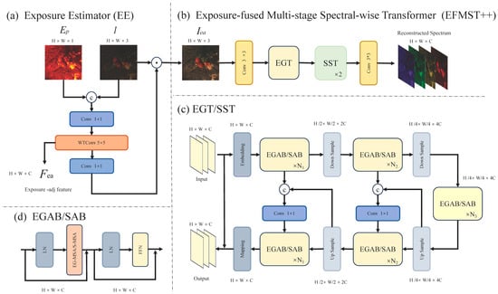 Our model architecture is shown in Figure 2, consisting of an exposure estimator (EE, Figure 2a) and a spectral reconstruction module (EFMST++, Figure 2b). The EE module is composed of three convolutional blocks. The core components of EFMST++ are the EGT and SST modules, as detailed in Figure 2c,d.