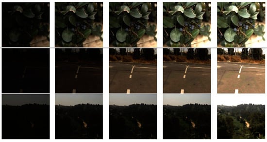 Therefore, we created an augmented dataset based on the ARAD 1K dataset by multiplying the original image with four random values of K (random Seed = 0). To keep the data balance of over-exposed and under-exposed images in the augmented dataset, two random values of K between 0 and 1 and two values of K between 1 and 3 were set in creating the database. Therefore, together with the original image, we obtained five random exposures of each original image, and a total of 4500 training images and 250 validation digital images, corresponding to 900 training and 50 validation multispectral images, were included in the augmented data. Some of the digital images are shown in Figure 4.