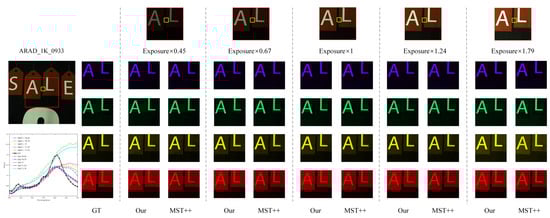 Example of multispectral reconstruction result comparison between our model and MST++ model according to different exposure levels.