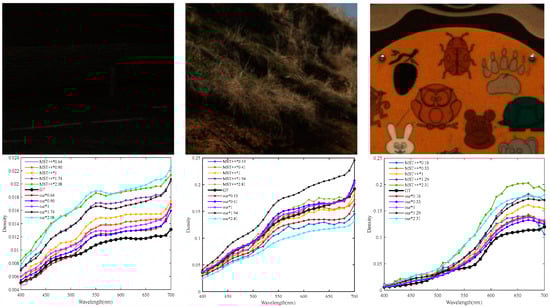 However, these algorithms or models have focused on improving the accuracy of multispectral reconstruction while neglecting the robustness of these models to expose changes in practical applications. Lin and Finlayson et al. found that existing multispectral reconstruction algorithms are sensitive to exposure []. As shown in Figure 1, even under the same light source, using a model constructed at one specific exposure level (such as Exposure*1) to reconstruct the spectral reflectance of objects at other exposure levels (such as Exposure*K) can cause the reconstructed spectral curves to deviate from the truth spectral curves to varying degrees when the exposure conditions are asymmetric.