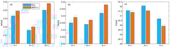 It can be seen from Table 4 and Figure 7 that our model is slightly superior to the MST++ model in all three conditions. In addition, both models achieved the best results when K = 1, the second best results when K < 1, and the largest error when K > 1, which indicates that they are still slightly sensitive to exposure changes.