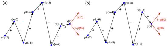 We define a special form of correlation in time series y(k), k = 1, …, N. The next state y(k + 1) will depend on the current state y(k) and on the sequence of p signs of the previous increments: Δ(k – p − 1),…, Δ(k), where Δ(k) = y(k) − y(k − 1). This relationship is related to the assumed probability of the next increase or decrease. We use a different notation for the probabilities (i.e., p p(i)) when the last increment was positive and a different notation (i.e., q q(i)) for those when it was negative (see Figure 1), where i = 1, …, 2p−1. This distinction will facilitate the introduction of the concepts of symmetric, asymmetric, and antisymmetric persistence in time series. Figure 1 shows the case when the last increment is positive (Figure 1a) or negative (Figure 1b); then, the probability that the next increment will follow the trend is related to the probability given by the parameter p(k) (q(k)).
