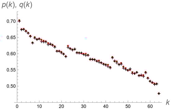 Fractional Brownian motion [23] was introduced as a generalization of Brownian motion for the case of long-range correlations. For this purpose, fractional integral was used, which involved taking into account the entire history of the process. Unlike our p-persistent model in which each state remembers only p previous increments, in fBm the memory includes all previous values of the process. Positive and negative correlations are symmetric in fBm, which corresponds to symmetric persistence in our model. Let us treat the series generated by fBm with H = 0.7 as if it were generated by our 7-order persistent model; then, the reconstruction of vector parameter D leads to values p(i) and q(i), shown in Figure 3. Since p(i) = q(i), i = 1,…, 64, this confirms the symmetry of persistence in fBm.