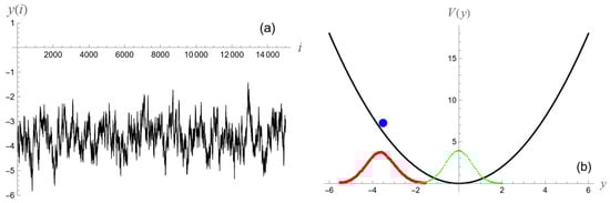 (a) Time series generated by Equation (2) with a(y) = −y, b(y) = 1 and antisymmetric parameters, Equations (9) and (10). (b) Potential V(y) (black graph) and distribution function f(y) (red graph) of the time series shown in plot (a). For a comparison, the green graph represents the distribution function for a symmetric case. The blue dot indicates a particle in the potential field.