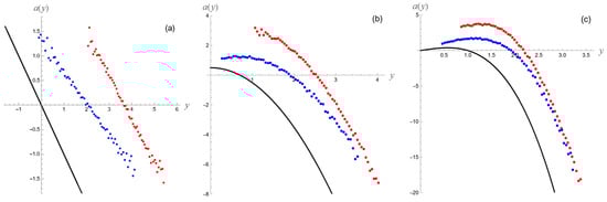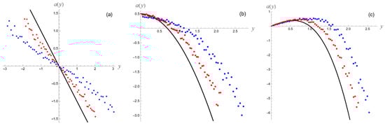 Standard procedure reconstructions of drift functions from time series generated by Equation (2) for two asymmetric forms of persistence parameters given by Equations (20) and (21) (blue points) and Equations (22) and (23) (red points). (a) Case M1; (b) case M2; (c) case M3. Black graphs represent the initial forms of a(y).