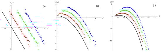 Standard procedure reconstructions of drift functions from time series generated by Equation (2) for three antisymmetric forms of persistence parameters given by Equation (17) (blue points), Equation (18) (green points) and Equation (19) (red points). (a) Case M1; (b) case M2; (c) case M3. Black graphs represent the initial forms of a(y).