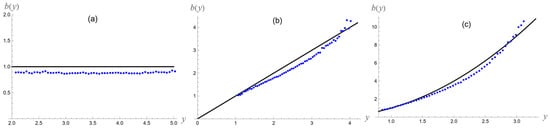 Standard procedure reconstructions of diffusion functions from time series generated by Equation (2) for the antisymmetric form of persistence parameters given by Equation (17) (blue points). (a) Case M1; (b) case M2; (c) case M3. Black graphs represent the initial forms of b(y).