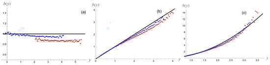 Standard procedure reconstructions of diffusion functions from time series generated by Equation (2) for two asymmetric forms of persistence parameters given by Equations (20) and (21) (blue points) and Equations (22) and (23) (red points). (a) Case M1; (b) case M2; (c) case M3. Black graphs represent the initial forms of b(y).