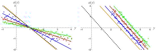 Visualizations of successive steps of the modified reconstruction procedure. Points represent the results of the standard procedure. Continuous lines are the least-square fits for a1(y) (blue), a2(y) (red), and a3(y) (green). The black dashed line shows the input a(y); the orange line is the final reconstruction aR(y). Left plot—symmetric case; right plot—antisymmetric case.