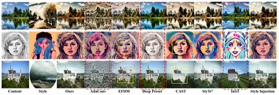 The comparison of single-style transfer results is shown in Figure 4, where EFDM and CAST have increased their models’ understanding of artistic style. However, excessive artistry leads to structural deformations and content ambiguity in the generated stylized images, as shown in yellow boxes. The AdaConv stylized effect differs from and does not align with the style image’s style (Column 4). Deep Preset and InST do not achieve significant stylized effects (see Columns 6 and 9). Ours, StyT and Style Injection, have a relatively good effect on style transfer; however, there are still obvious differences in color, brightness, clarity, semantic alignment and other aspects of the stylized images, which will be further compared in the subsequent analysis.