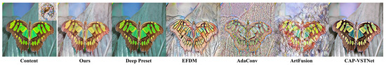 As shown in Figure 6, the proposed method aligns the color styles of the front and background of the stylized image with the style image, and aligns the semantics and layout with the content image, resulting in a clearer visual effect. Although the experimental results of ArtFusion are consistent with the color and texture of the style image, the semantic and layout of the generated results deviate significantly from the content image, and the structure of the butterfly is largely blurred. CAP-VSTNet and Deep Preset have no obvious effect of style transfer. The style transfer effect of EFDM is good; however, the butterfly antenna is blended in with the background information, making it difficult to identify. AdaConv’s experimental results match the content image semantics, but the style effect is excessively grainy. Figure 7 shows additional HD photorealistic style transfer results of the proposed method.
