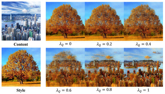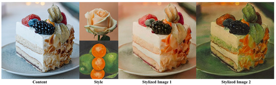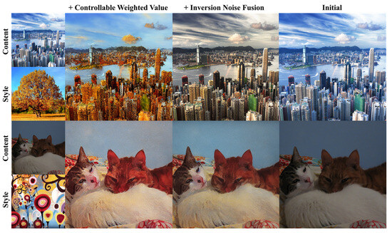 Figure 14 illustrates how each component of the inversion noise fusion method affects the style transfer effect. As indicated in the first line, controlling the change of weight alone affects the sharpness of the generated stylized image. As shown in the second line, under the constraint relationship: , the weight adjusts the color tendency of the stylized image. A bigger indicates a more inclined color to the content image, whereas a lower indicates a more inclined color to the style image. By increasing the weight , the color of the stylized image is closer to that of the style image. It can be seen that the inversion noise fusion method has a certain effect on the color, brightness, and sharpness of the stylized image.