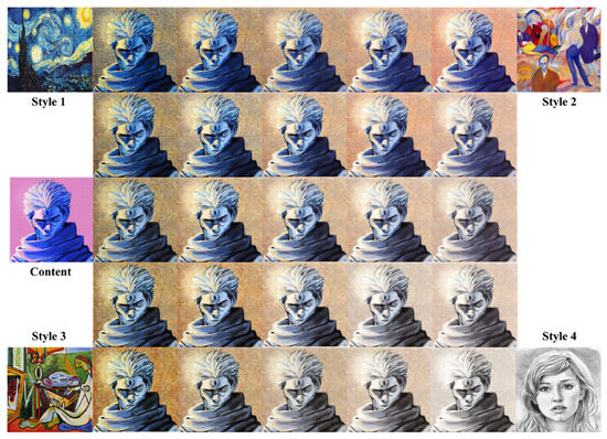 Figure 8 shows the performance of the proposed method in terms of image multi-style transfer. The experimental results achieve a good transfer of color and texture features, allowing for a more targeted choice of style preferences. The multi-style transfer process, depending on the weight of various styles, generates a rich and diverse style superposition effect.
