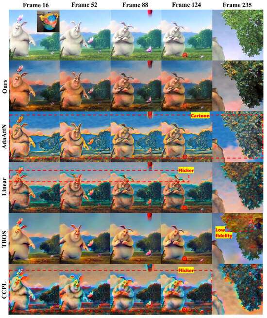 AdaAttN [46], Linear [47], TBOS [36], and CCPL [37] serve as baselines for video style transfer quantitative comparisons. The purpose of optical flow error is to compute the motion vector of each pixel between two frames using image information from succeeding frames in order to determine a video’s smoothness. ArtFID is used for evaluating video styles. In the quantitative comparison experiment of video style transfer, we calculate each frame’s evaluation metric to obtain the average value, which is then used as the evaluation metric for this group of experiments.