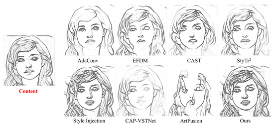 Evaluation metrics. According to previous work [19,31], this paper selects ArtFID [32] to evaluate the stylized effect of image style transfer, and LDC [33] + SSIM [34] to detect the similarity between stylized images and content images. The ArtFID indicator, which evaluates the overall style transfer performance in the context of a comprehensive analysis of content and style fidelity, is considered to be very consistent with human judgment. The calculation formula of ArtFID is , where LPIPS [35] is used to measure the content fidelity between the stylized image and the corresponding content image, and FID [29] is used to evaluate the style fidelity between the stylized image and the style image. In this paper, LDC [33] outputs fine image edges that are used for SSIM [34] content similarity detection, which helps to avoiding interference from the style effect and accomplish fine detection. For video style transfer, according to previous work [19,36,37], optical flow error [38] and ArtFID [32] are selected in this paper as evaluation indicators of video temporal consistency and stylization effect, and the mean value of each frame indicator is used as the indicator result of the video.