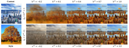 As shown in Figure 16, in the process of controlling the value of the self-attention key vector of the stylized images, under the premise of the normal value of Q, when the weight of the style image key vector is larger, the style effect is more visible and the image is clearer. The value vector follows the same change trend as the key vector, but its color effect is not so sharp; however, leaving the value vector out will inevitably weaken or blur the style effect. It can be seen that it is beneficial to enhance the style effect by setting the values of the above hyperparameters reasonably.