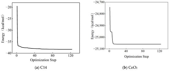 Following the construction of the C14 and CeO2 molecular models, Geometry Optimization was carried out using the Forcite Geometry Optimization module, with a simulation duration of 250 ps. The energy fluctuations during the optimization process are illustrated in Figure 3. The results demonstrate a steady decrease in the structural energy of both molecular models over the course of the calculation, ultimately reaching a stable state. This stabilization confirms the suitability of these models for constructing subsequent nano-fuel molecular systems [18,19,20,21,22].