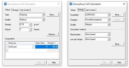 After optimizing the C14 and CeO2 molecular models, the Packing module in the Amorphous Cell (AC) was employed to construct the CeO2 nano-fuel molecular model, with the parameter settings outlined in Figure 4. The convergence accuracy of the model has a significant impact on the computational time. Through a series of simulations, it was determined that setting the convergence precision to “Medium” provided an effective balance between accuracy and computational efficiency. The density of C14 was set to 0.76 g/cm3, and the CeO2 molecular model was configured with a fill factor of 1. From the current calculation results, the selection of high precision can slightly optimize the molecular geometry, reduce the initial potential energy of the system, and improve the accuracy of energy calculation. The calculation of RDF and diffusion coefficients may be slightly improved, with error variations of no more than 2–3%. During computing, it was found that the use of “High” accuracy resulted in a 5–10-fold increase in optimization time, which significantly increased the total amount of computation for simulations involving multiple temperature field calculations. Since this study focuses on the trend of temperature influence on CeO2 nano-fuel diffusion behavior and heat transfer and does not rely on structural optimization with extremely high precision, the use of “Medium” precision is reasonable. To sum up, the selection of “Medium” accuracy is based on the optimization consideration between calculation time and accuracy. The literature research and test results show that compared with “High” accuracy, the calculation error under “Medium” accuracy is usually within the acceptable range (less than 3%), and the calculation time is significantly reduced, ensuring the feasibility and efficiency of the simulation. Therefore, the accuracy of “Medium” will not significantly affect the reliability of the research conclusions.