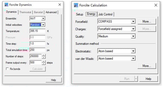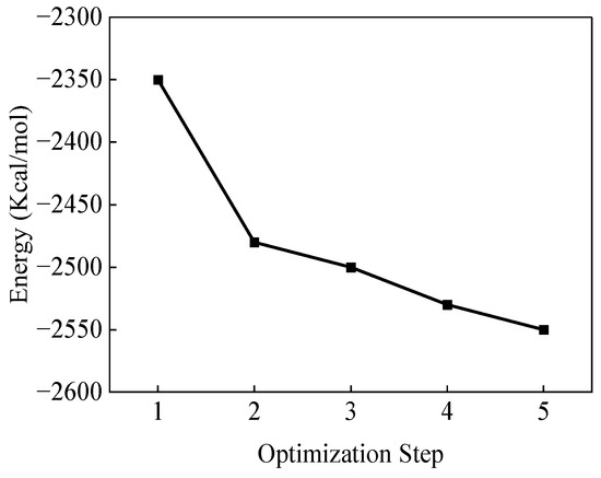 The Packing module in the Amorphous Cell (AC), based on the Monte Carlo method, generates amorphous random models. However, these models may exhibit unrealistic intermolecular distances and excessive system energy, which can significantly impact the accuracy of molecular dynamics simulations [23,24,25]. Consequently, it is essential to optimize the model structure and minimize system energy before performing molecular dynamics calculations.