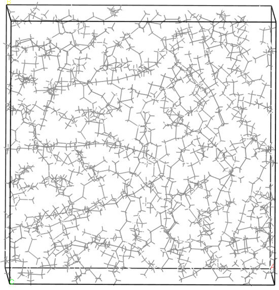 The impact of nanoparticle size, mass concentration, and system temperature on the thermal properties of nano-fuel was investigated by analyzing thermal conductivity, heat flux distribution, and temperature gradients. Figure 8 shows the C14 fluid model constructed using the construction module in the Amorphous Cell (AC), comprising 1140 C14 molecules with a system density of 0.76 g/cm3 and dimensions of 72 Å × 72 Å × 72 Å. Following its construction, the C14 fluid model underwent structural optimization and annealing using the Forcite module, with parameter settings identical to those used for the CeO2 nano-fuel system.