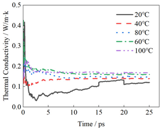After completing structural optimization and annealing, a Perl script was developed to calculate the thermal conductivity of the C14 fluid. Along the Z-axis of the model, 20 layers were defined, with layers 0 and 19 designated as hot zones and layer 10 as the cold zone, forming a mirror-symmetric arrangement about layer 10. At a system temperature of 80 °C under the NVT ensemble, the thermal conductivity of the C14 fluid was determined to be 0.1229 W/(m·K). The variation in the C14 fluid’s thermal conductivity over simulation time is shown in Figure 9. The random motion of nanoparticles is a key factor influencing energy transfer within nano-fuels, while system temperature directly affects the intensity of such micro-movements. As can be seen from Figure 9, the thermal conductivity of nano-fuel is closely related to temperature, and the thermal conductivity increases with the increase in system temperature. The thermal conductivity of nano-fuel at different temperatures is shown in Table 3, from which it can be seen that when the system temperature is 60 °C and 100 °C, respectively, the thermal conductivity of nano-fuel is 0.1440 W/(m·K) and 0.1622 W/(m·K), respectively. Compared with the thermal conductivity of nano-fuel at 20 °C, it is increased by 9.8% and 23.6%, respectively.