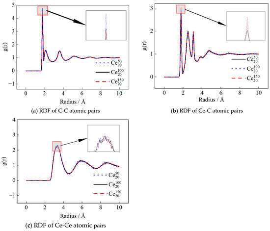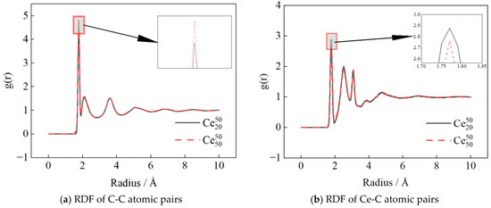 To elucidate the influence of nanoparticle size on nano-fuels, the radial distribution functions (RDFs) for C-C and Ce-C atomic pairs in the Ce50 nano-fuel system were analyzed at varying particle sizes. Figure 12a illustrates the RDF curves of C-C atomic pairs in the CeO2 nano-fuel system under different nanoparticle sizes. Similarly to the findings in the previous section, the RDF of C-C pairs exhibits the characteristic “short-range order, long-range disorder” typical of base liquid fuel. The addition of nanoparticles alters the microstructure of the base liquid fuel. Notably, the first peak of the RDF is higher in the nano-fuel system compared to the system, indicating that as nanoparticle size increases, the likelihood of one C atom encountering another in the CeO2 nano-fuel system rises.