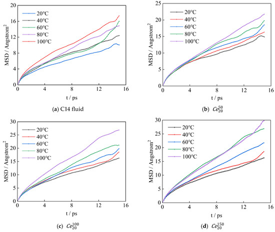Figure 13 shows the MSD curves of C14 molecules in the Ce20 nano-fuel system at various temperatures. The simulation results indicate that the slope of the MSD curves increases with rising temperature, signifying greater molecular movement. A higher slope corresponds to a larger molecular displacement, reflecting more pronounced thermal motion. A comparison of Figure 13a–d reveals that, at the same temperature, the displacement of C14 molecules in the nano-fuel system exceeds that in the pure C14 fluid system. Moreover, the slope of the MSD curves becomes steeper as the mass concentration of nanoparticles increases, indicating greater molecular displacement per unit time and more intense thermal motion. Consequently, nano-fuels with higher mass concentrations exhibit greater thermal conductivity.