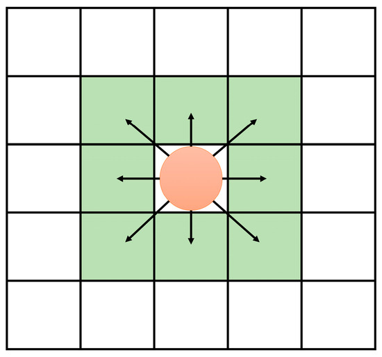 Based on the principle of cellular automata, this paper divides the evacuation space into a number of discrete two-dimensional tuples, with the dimensions of individual tuples set as 0.4 × 0.4 [29]. Depending on the actual situation, there are three states for each cell: occupied by people or walls (obstacles) and idle. For the convenience of the evacuation simulation, it is assumed here that each metacell can accommodate at most one person. The neighborhood is of a Moore type, with the radius taken as one tuple length, and the range of tuple neighborhoods and their possible directions of movement are shown in Figure 1, where the orange tuples represent the location of the personnel, and the green tuples represent the neighboring tuples reachable by the personnel.