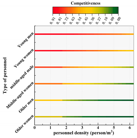 The competitiveness power function borrows from Stevens’ law in psychophysics [34]. This law declares a power relationship between two different types of psychological intensities and has been successfully applied in many fields, such as in human decision-making processes of interpreting probability weighting functions [18] and in extended metacellular automata models characterizing competitiveness [19].The values of the personnel age coefficients, , and gender coefficients, , are shown in Table 2. In the model, the age coefficients of the evacuated personnel are determined by taking a random distribution. When the age coefficients are taken at the median, the competitiveness intervals for each pedestrian source are shown in Figure 2. The color scale in Figure 2 indicates the values of competitiveness corresponding to different colors, where redder colors indicate greater competitiveness and greener colors indicate less competitiveness. In the same situation, males are about 19% more competitive than females [21,22,35]. As can be seen in Figure 2, the distribution of competitiveness among different categories of personnel is asymmetrical.
