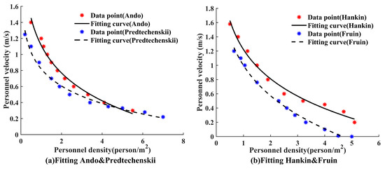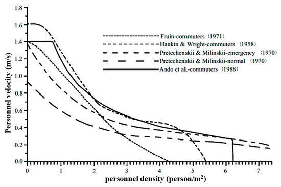 It is well known that there is a strong relationship between personnel density and personnel velocity [26,27,28,36]. Figure 3 [36] shows the statistics of different scholars who have studied the relationship between personnel density and personnel velocity. As can be seen in Figure 3, the speed of personnel will decrease as the density of personnel increases. Considering the combined effect of left/right, front/back crowding and other factors on evacuation speed during evacuation, the relationship between personnel density and personnel speed can be described in the form of an index as follows Equations (2)–(4) [28].