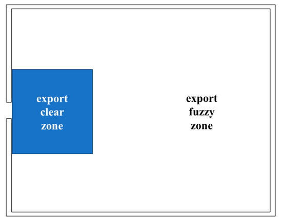In order to facilitate the consideration of the impact of exit information on evacuation, this paper divides the pedestrian movement area into two parts: the exit clear zone and the exit fuzzy zone (Figure 5), and the area is symmetrical up and down. The personnel located in the clear exit area can clearly receive the exit information, and its movement is mainly affected by the static field; the personnel located in the fuzzy exit area cannot clearly receive the exit information due to the distance from the exit, so its movement is affected by the static field, dynamic field, repulsive force field, and other factors.