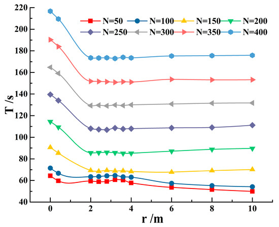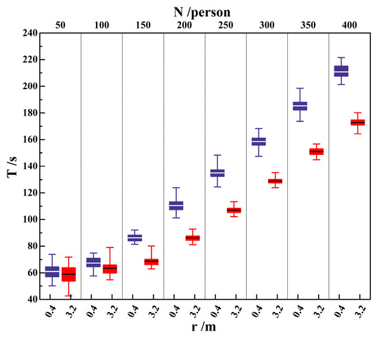 The number of evacuees, , between 50 and 400 was measured in 8data using equal variance (the exact values are shown in Figure 6), with a male to female gender ratio of 1:1. The age composition is distributed according to young, middle-aged and old, with a ratio of young/middle/old = 5:3:2. After computer simulation, the relationship between pheromone diffusion radius and evacuation time is shown in Figure 6. From Figure 6, it can be seen that when is less than 150, the evacuation time decreases with the increase in pheromone diffusion radius. When is greater than 150, the pheromone diffusion radius increases from 0 m to about 4 m, and the evacuation time decreases significantly with the increase in the pheromone diffusion radius. However, when the pheromone diffusion radius increases from about 4 m to 10 m, the evacuation time tends to increase. That is, optimal evacuation is achieved when the pheromone diffusion radius is approximately 3 m.