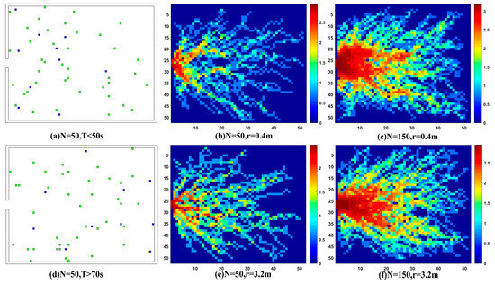 To further understand the effect of pheromones on the evacuation of people, 0.4 and 3.2 were selected, and the comparison of evacuation time is shown in Figure 7. When the number of evacuees is small, the box range of evacuation time is larger, which is due to the fact that the random distribution of the initial location of pedestrians may appear to be concentrated in the area near the exit or away from the exit area. Taking N = 50 and 150 as an example, the r = 0.4 and 3.2 pheromone distributions and initial locations of pedestrians are shown in Figure 8. Green squares are for young and middle-aged people, and blue squares for older people. From Figure 8a,d, it can be seen that the evacuation time is less than 50 when there are fewer people dispersed in the space and the elderly are in the position closer to the exit, and the evacuation time is higher than 70 when there are more people dispersed in the space and there are elderly people in the position far away from the exit.
