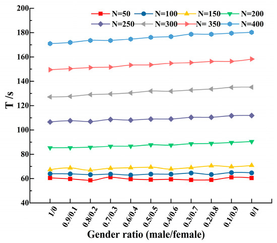 The gender composition was linearly interpolated from 0 to 1 in steps of 0.1 according to the male/female ratio (male/female), the sum of the ratios was 1, was taken to be 50 to 400, the difference was taken to be 50, the age composition was taken to be 5:3:2, and 3.2 . Evacuation time variations are shown in Figure 9, where the evacuation time curve goes flat when the number of pedestrians is below 150. When the number of pedestrians is higher than 150, the increase in the proportion of males has a positive effect on the reduction in evacuation time, for example, with , the evacuation time of all male pedestrians is 5% lower than that of all female pedestrians.