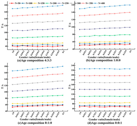 When the age composition is taken as 4:3:3, 1:0:0, 0:1:0, and 0:0:1, the evacuation time changes as shown in Figure 10. Gender composition was not significantly correlated with evacuation time at pedestrian counts below 150 was not affected by age composition. As can be seen from Figure 9 and Figure 10a,b, the effect of gender ratio on evacuation time is stable without changing the pedestrian body. As can be seen in Figure 10b,c, gender composition has a greater impact on evacuation time for middle-aged people than for young people. Using 400 as an example, the age composition of 1:0:0 and 0:1:0 reduces the evacuation time by 7 and 8%, respectively. From Figure 10d, it can be seen that the evacuation time of the elderly is not affected by the gender composition, and the time curve goes flat, which is due to the fact that the elderly, both men and women, move slower, and the increase in the proportion of males does not enable them to reach the exit more quickly.
