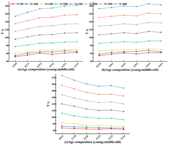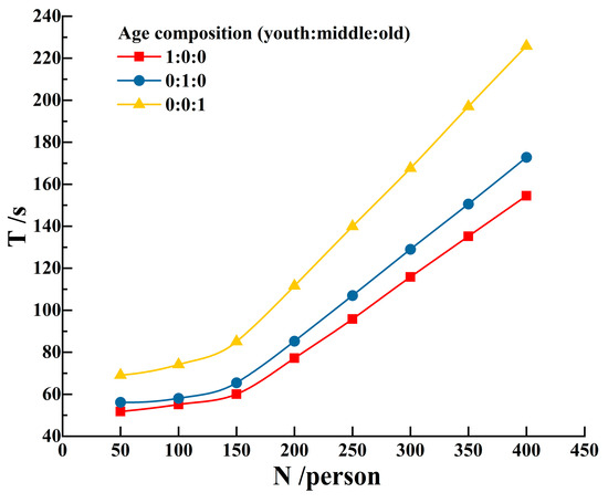 Changes in evacuation times when the age composition is all young, middle-aged, and elderly.